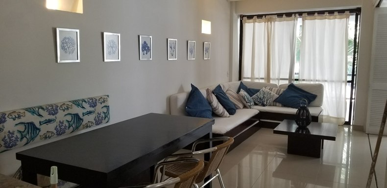 Excelente distribución, habitación principal, con aire acondicionado. Habitación secundaria, 2 camas sencilla con camas auxiliares, cuenta con 2 puertas corredizas, al cerrarlas se convierte en un espacio independiente. Cocina con extractor de olores, comedor para 5 personas. Sala con muy buena iluminación, y acceso directo al balcón y hamaca; cuenta con 2 sofás camas con colchones semiortopedicos.